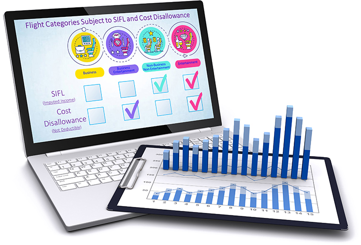 Reporting requires tracking every passenger on every flight leg to identify and classify if traveling for non-business purposes is subject to cost disallowance. Final IRS regulations allows the cost disallowance percentage to be calculated under four different methods: